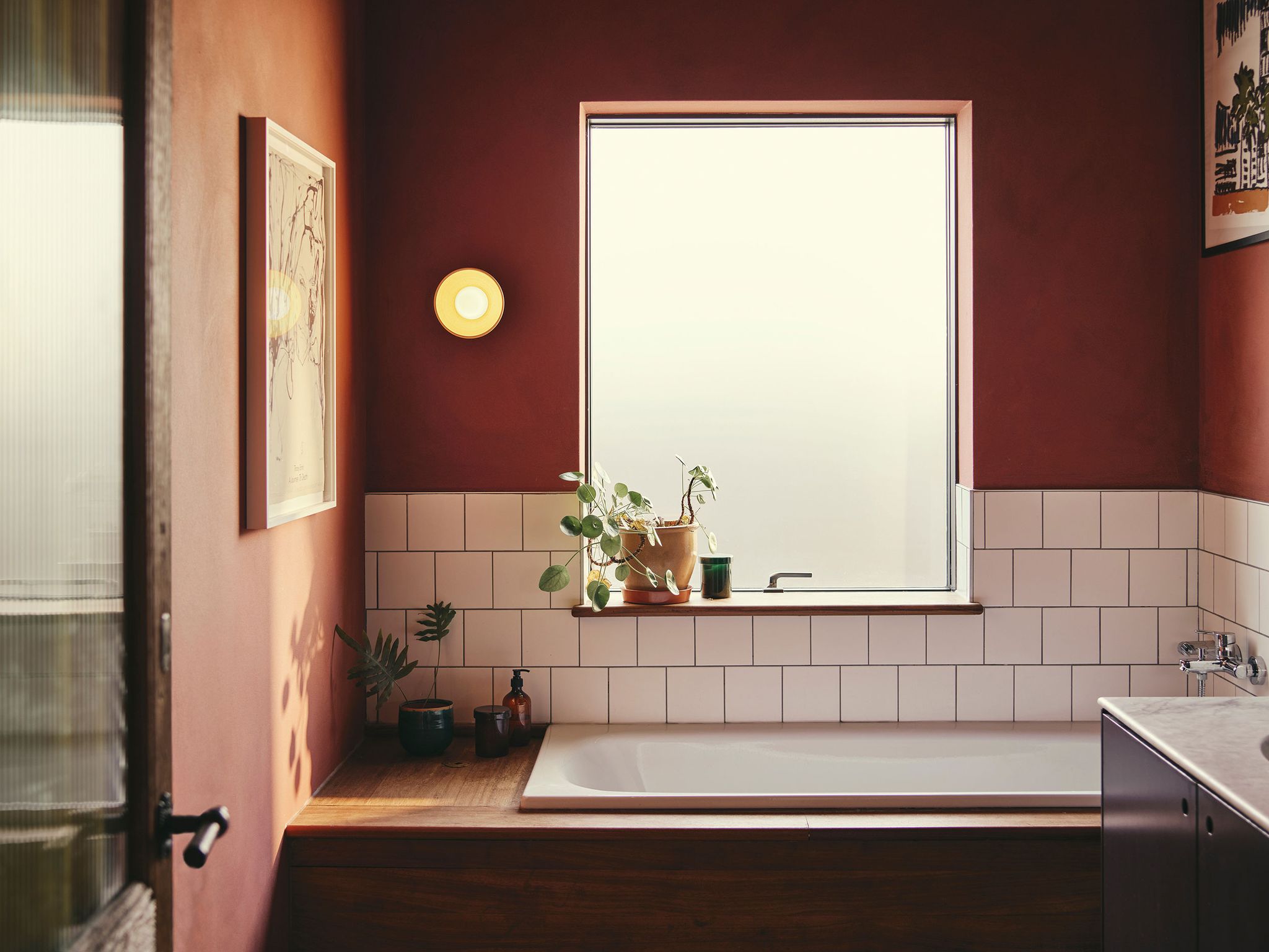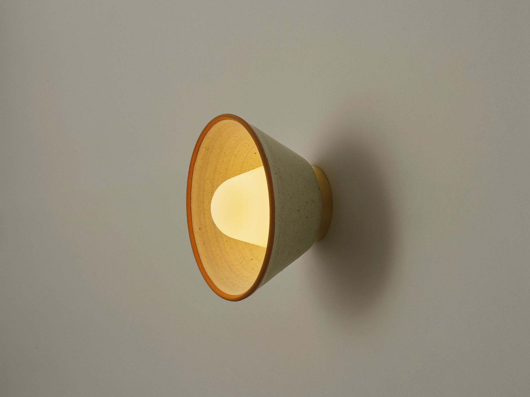 The shade is glazed in a soft off-white, with the glaze enlivened by the iron added to the ceramic, giving the shade a subtle yellow/green speckle and allowing its materiality to shine through. The rim is glazed in a matt slip in a choice of colours – green, orange or pink.